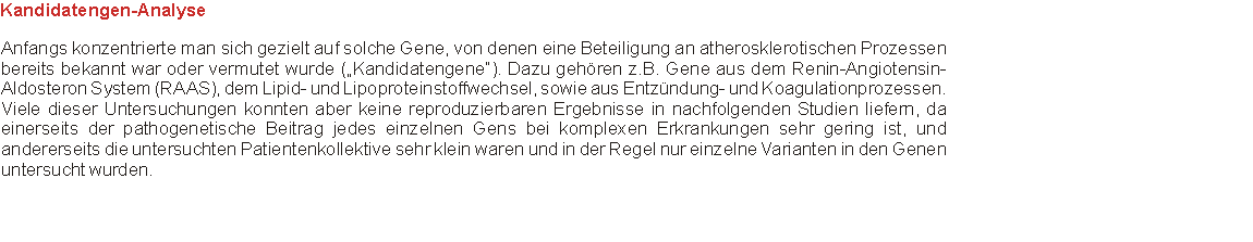 Anfangs konzentrierte man sich gezielt auf solche Gene, von denen eine Beteiligung an atherosklerotischen Prozessen bereits bekannt war oder vermutet wurde („Kandidatengene“). Dazu gehören z.B. Gene aus dem Renin-Angiotensin- Aldosteron System (RAAS), dem Lipid- und Lipoproteinstoffwechsel, sowie aus Entzündung- und Koagulationprozessen. Viele dieser Untersuchungen konnten aber keine reproduzierbaren Ergebnisse in nachfolgenden Studien liefern, da einerseits der pathogenetische Beitrag jedes einzelnen Gens bei komplexen Erkrankungen sehr gering ist, und andererseits die untersuchten Patientenkollektive sehr klein waren und in der Regel nur einzelne Varianten in den Genen untersucht wurden.